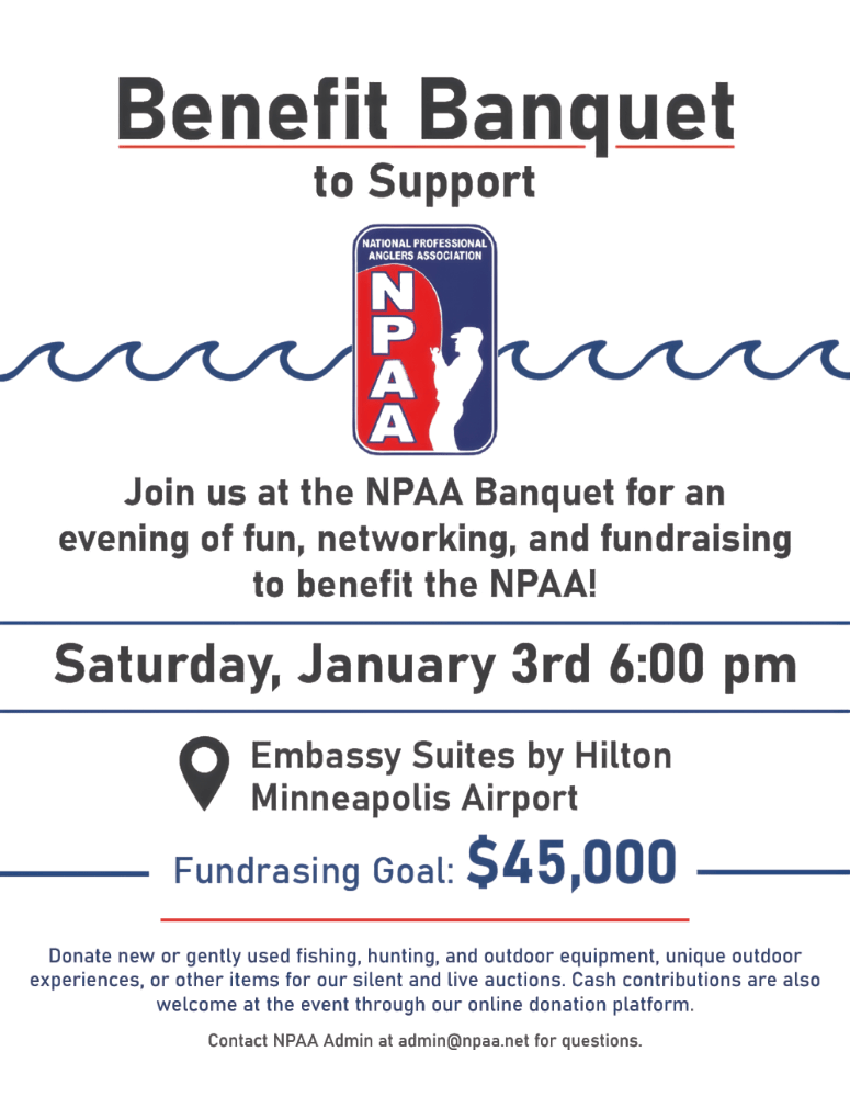 Special Presentation: 9:30 AM – 10:30 AM – Sara Trampe – Casting Confidence: Women Leading the Way in Angling 10:30 AM – 10:45 AM – Break 11:00 AM – 11:50 AM – Keynote: Jason Mitchell “Authenticity and Integrity – Keys for Success as a Professional Angler” 12:00 PM – 1:20 PM – Networking Lunch (Sponsored by ASA) 1:30 PM – 2:20 PM – Keynote: John Crews “25 Years as a Professional Angler: It is a Job” 2:20 PM – 2:45 PM – Awards Presentation & President’s Remarks 2:45 PM – 3:00 PM – Break Educational Breakout Sessions 3:00 PM – 3:50 PM – Corey Heiser – Retaining Local Sponsorships 4:00 PM – 4:50 PM - Matthew Crawford – Social Media Tips & Tricks 5:00 PM – 5:50 PM - Joe Henry / Lake of the Woods Tourism – Working with Destination Marketing Organizations (DMO) 6:00 PM – 7:00 PM – Benefit Reception (Raffle items & Silent Auction) 7:00 PM – 10:00 PM – NPAA Benefit Banquet – Dinner & Live Auction